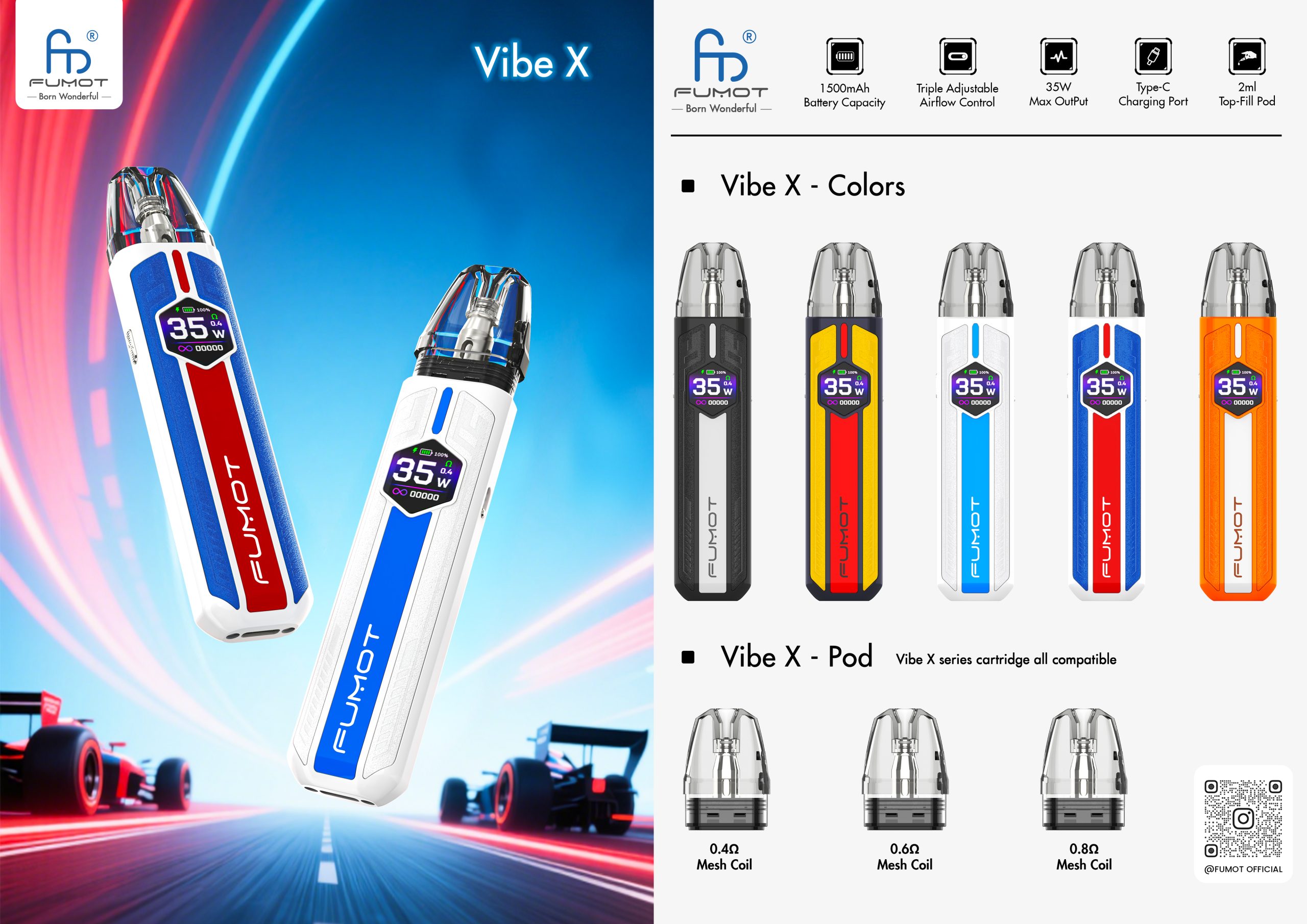 The Vibe X is a refillable & replaceable pod system with standout features: It offers strong triple adjustable airflow control 2ml top-fill pod for easy and leak-proof refills,max 35W output to deliver rich flavors with mesh coils, and 1500mAh rechargeable battery with Type-C fast charging—balancing runtime and performance, ideal for vapers seeking personalization and practicality.